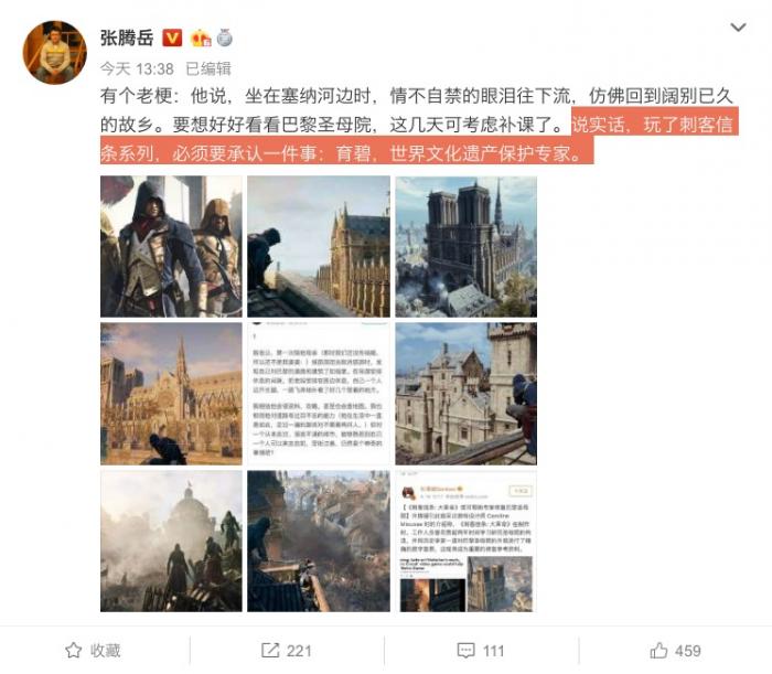 央视主持人张腾岳在微博评论到,“说实话,玩了刺客信条系列,必须要承认一件事:育碧,世界文化遗产保护专家。”