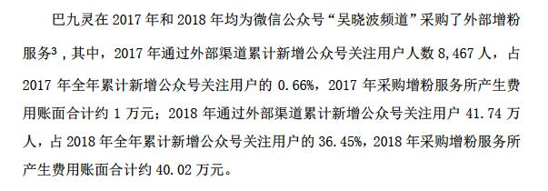 回复函中,全通教育解释称,2017年及2018年,巴九灵为“吴晓波频道”采购了外部增粉服务,其中,2017年通过外部渠道累计新增关注用户8467人,占新增关注用户的0.66%,2017年通过外部渠道累计新增关注用户41.74万人,占新增关注用户的36.45%,相当于两年合计“买粉”42.58万人。