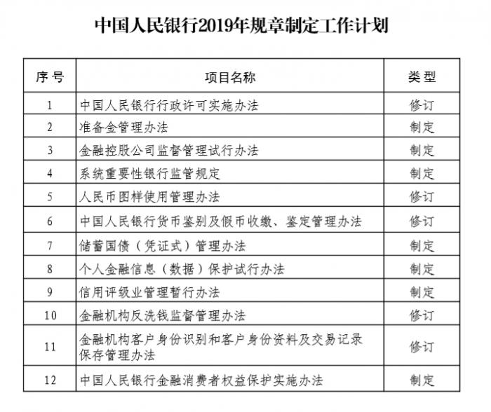 4月16日晚间,央行官网公布了2019年规章制定工作计划。公告显示,央行在2019年共有12个规章制定列入工作计划,其中7部待制定,5部待修订。