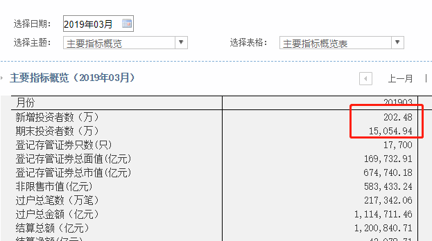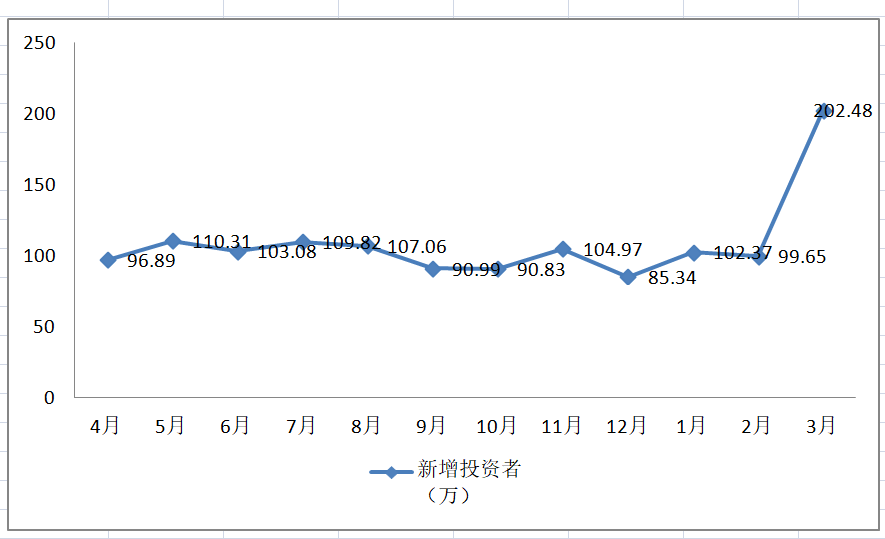 2019年3月新增投资者数量为202.48万,环比增长了103.19%,单月新增投资者数量创下2017年4月以来的新高。3月平均一周就有50万股民新入市了。