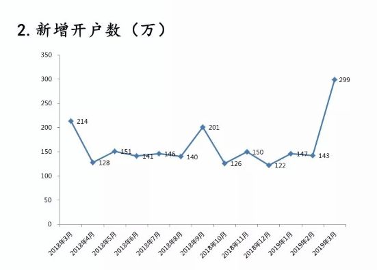 在过去一年内,只有2个月份的新增开户数超过200万户,分别是2018年3月和2018年9月。而2019年3月份是相隔5个月后重返200万户规模之上。