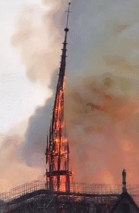 没过一会儿,伴随着高耸入云、无法控制的火势,这座教堂,标志性的尖顶轰然倾斜而下!