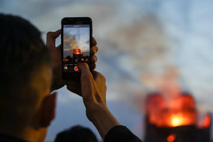 在警方警戒线后,巴黎当地居民和外国游客惊恐而伤心地看着凶猛的火焰将这座历史悠久的教堂圣地无情地吞噬,目击者纷纷跪在地上为之唱颂祈祷。