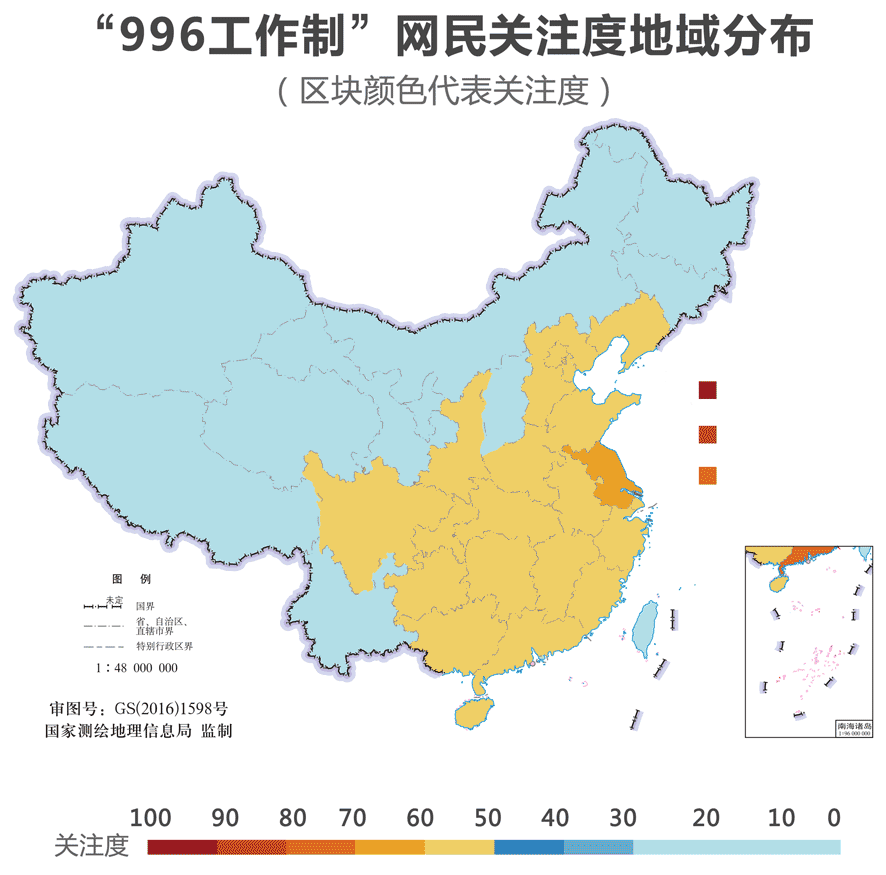 大数据分析显示,北京、上海、广东、浙江成为讨论“996工作制”最热烈的区域。这主要是由于这些地方互联网企业发达,生活成本高、节奏快,加班已成为常态。