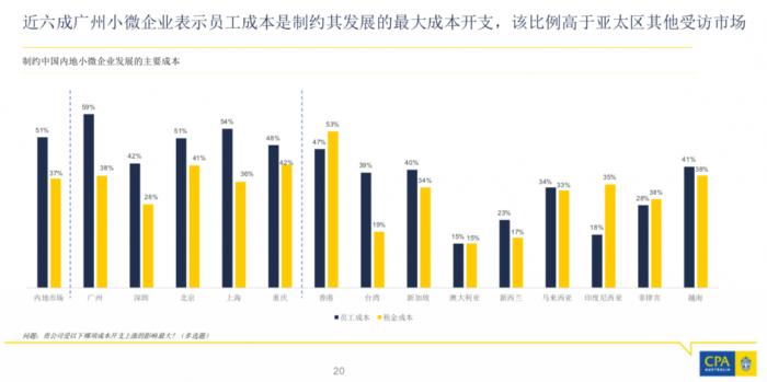 调查显示,上涨的成本,尤其是员工成本,是2018年最有可能制约华南地区小微企业发展的因素。近60%广州受访者表示员工成本是制约其业务发展的最大成本开支, 该比例高于亚太区其他受访市场。
