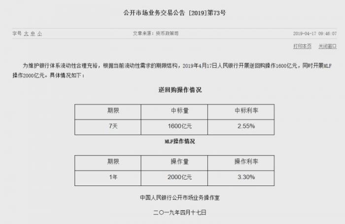 4月17日,人民银行发公告称,为维护银行体系流动性合理充裕,根据当前流动性需求的期限结构,2019年4月17日人民银行开展逆回购操作1600亿元,同时开展MLF操作2000亿元。另外,今日还有3665亿元MLF到期。