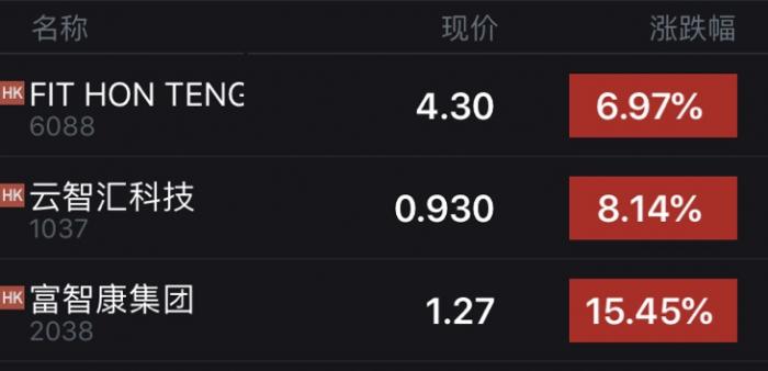 港股方面,富智康集团(2038.HK) 午后大涨,一度拉升至20.91%,截至发稿,报1.27港元,涨幅15.45%;云智汇科技(1037.HK)最高拉升至12.79%,回落后再度拉升,截至发稿,报0.93港元,涨幅8.14%;鸿腾精密(6088.HK)最高涨幅逾7%,截至发稿,报4.30港元,涨6.97%。