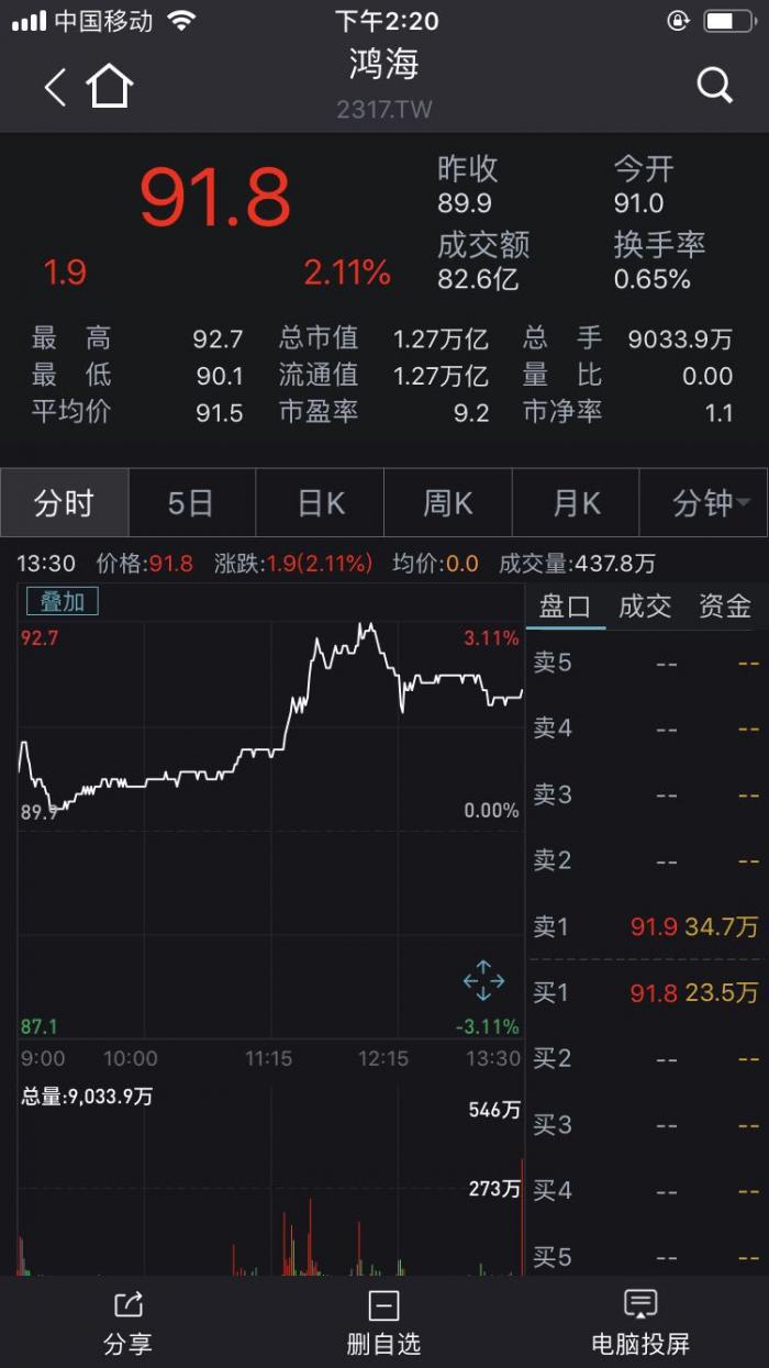 台北上市的鸿海(2317.TW) 股价昨日就开始上涨,一度上涨2.4%至91.4台币,创去年10月9日以来盘中新高。今日继续上涨,报91.8元,涨2.11%。