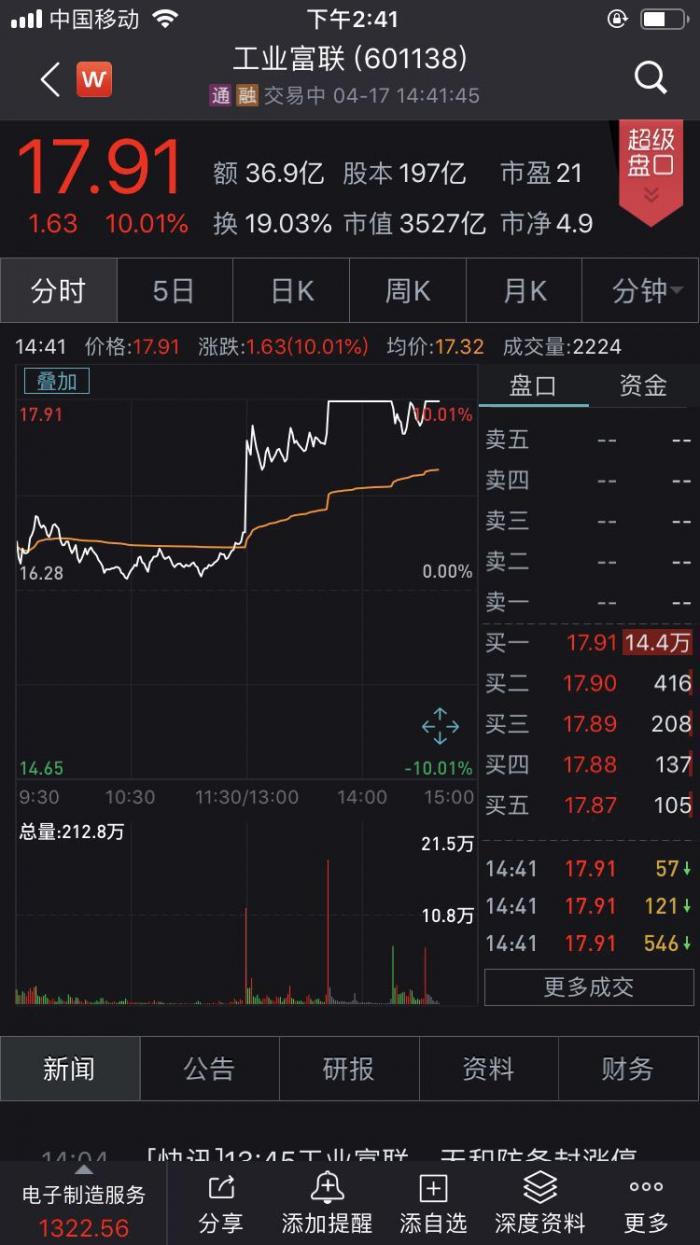 工业富联(601138.SH)午后涨停,封单30万手,股价创去年7月来新高。虽一度开板,后又再度冲击涨停,报17.91元。