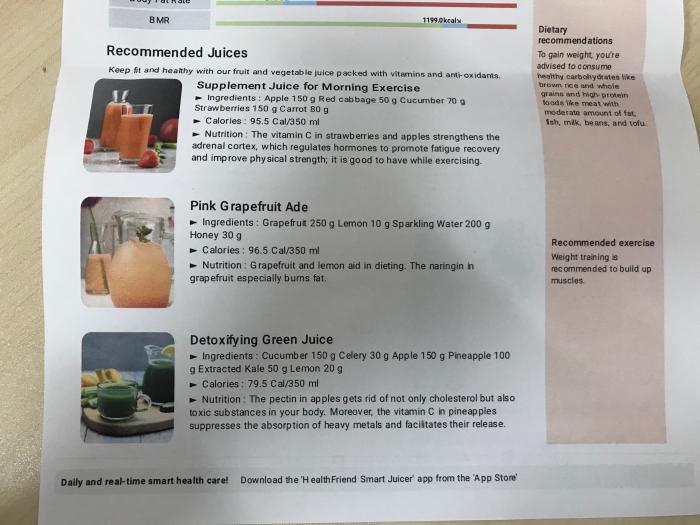 乍看之下就是一个榨汁机。但记者采访获知,这个并不是一个普通的榨汁机。使用者在机器连接的APP中输入身高体重,手捏上图机器左右两侧的圆圈站立十秒后,APP就可以统计出使用者的基本身体情况,包括体脂率、体内含水量、体内含矿量等,然后根据这些信息为使用者匹配合理的营养结构,推荐果汁的选择: