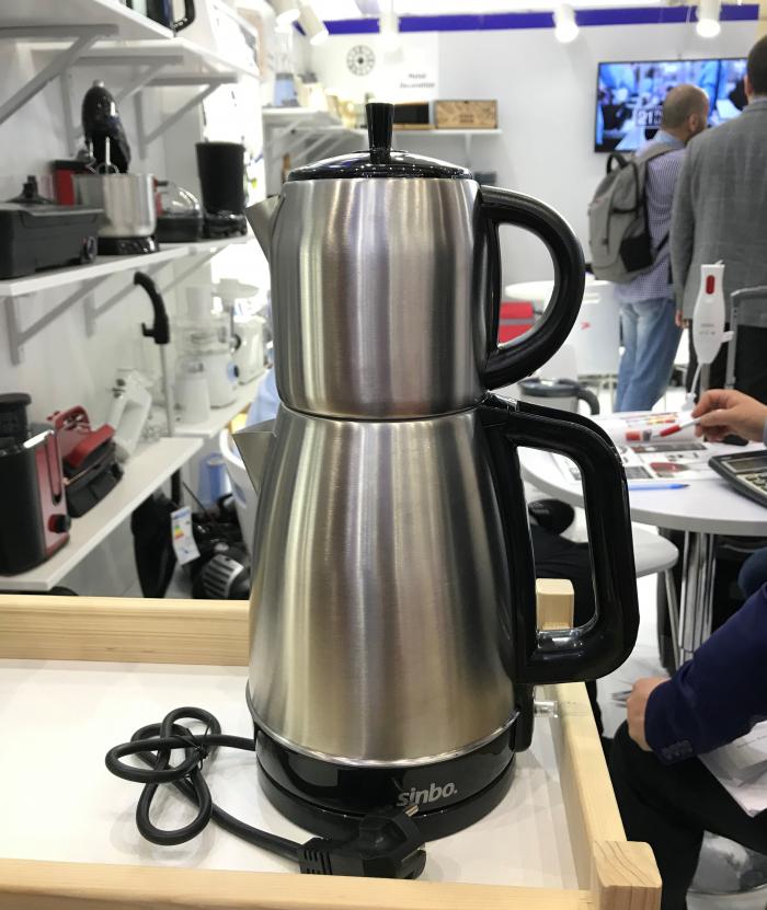 两个水壶叠加在一起.......???记者采访获悉,这个是土耳其特色的茶壶。土耳其在设计茶壶时都沿用此设计,上面的小水壶里放茶叶和水,下面的大水壶里放水,这样泡出来的茶叶味道十分不同。不过,这样的土耳其茶壶在中国市场并不大,毕竟中国消费者喝茶的习惯和土耳其并不一样,但Sinbo展位负责人告诉21世纪经济报道记者,这些茶壶在中东地区、德国等国家还卖得挺好的。