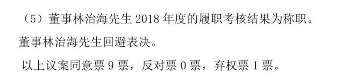 值得注意的是,在董事2018年年度履职考核中,对于担任董事职务的总裁林治海,有独立董事投下1张弃权票。