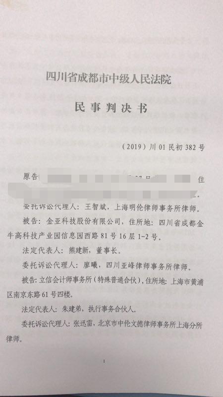 近日,四川成都市中级人民法院判定,被告金亚科技于本判决生效之日起十日内赔偿因虚假陈述给原告郭某造成的损失28084.01元;被告立信会计师事务所(特殊普通合伙)对被告金亚科技的上述责任承担连带赔偿责任。