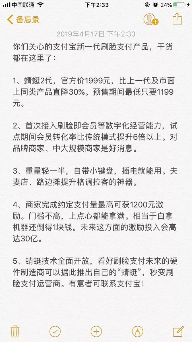 2018年12月,支付宝推出首个刷脸支付机具产品“蜻蜓”,官方售价2688元,由此正式开启刷脸支付线下商业应用时代,据悉目前已经在全国300多个城市落地。4月17日,支付宝宣布推出第二代刷脸支付机具“蜻蜓”,定价1999元,相比第一代直降近30%。刷脸支付设备无需任何外接设备。外形变化之外,二代刷脸支付机具强调“刷脸即会员”,即刷脸注册会员卡,支付宝方面称,前期刷脸注册会员转化率比传统模式提升6倍以上。