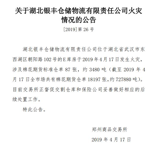 4月17日晚间,郑商所公告,湖北银丰仓储物流有限责任公司位于湖北省武汉市东 西湖区朝阳路102号的E库房于2019年4月17日发生火灾,涉及棉花期货标准仓单87张,约3480吨。