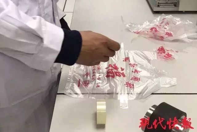 为了看清油墨掉色情况,4月11日,江苏省绿色可降解材料中心进行了现场实验。中心检测人员刘鹏远将透明胶带贴在塑料袋印刷文字上,随后撕掉,透明胶带上染上了明显的红色。“从染色的情况来看,掉色程度达到40%,超标了。”