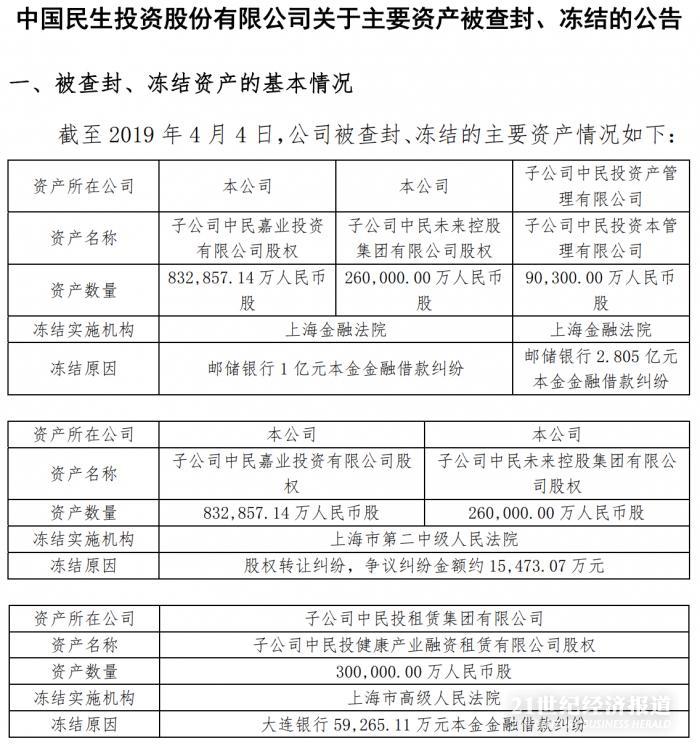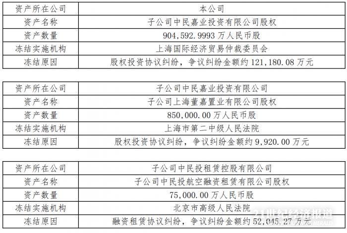 二是上海金融法院和上海高院下令冻结了中民投及其部分子公司资产,具体内容如下: