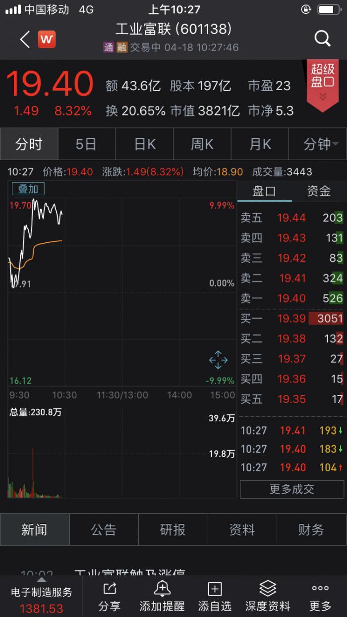 截至记者发稿,工业富联报19.4元,成交金额43.6亿元,换手率20.65%。