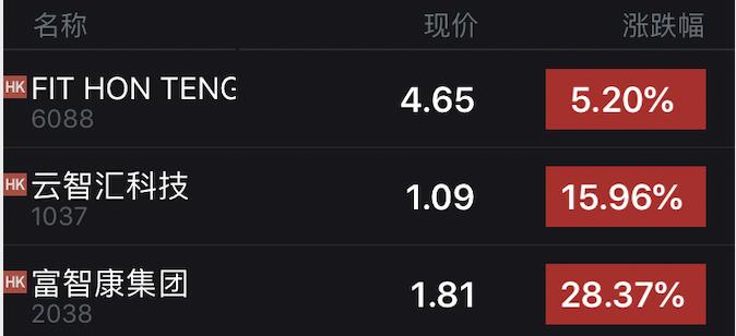 港股方面,富智康集团(2038.HK)报1.81港元,涨幅28.37%;云智汇科技(1037.HK)报1.09港元,15.96%;鸿腾精密(6088.HK)报4.65港元,涨幅5.20%。