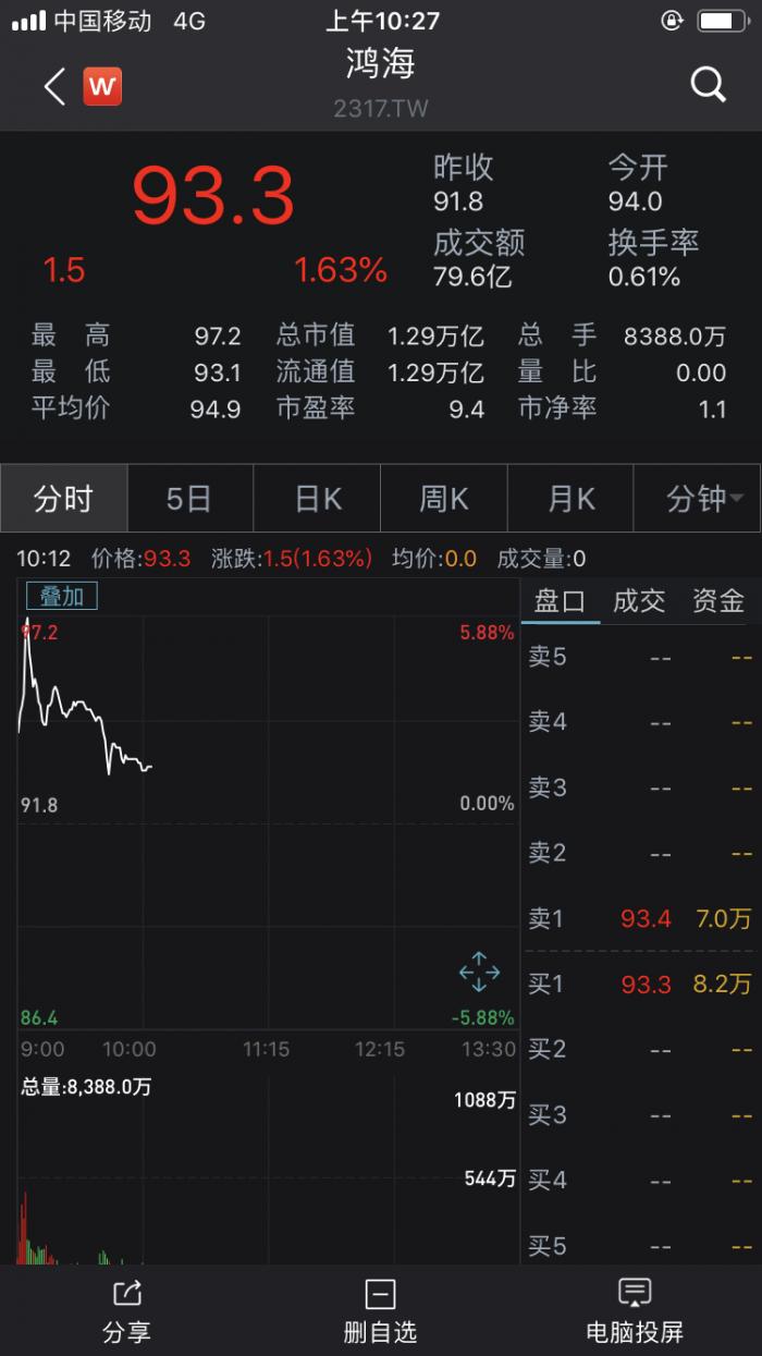 台股鸿海(2317.TW)继续上涨,报93.3台币,涨幅1.63%。