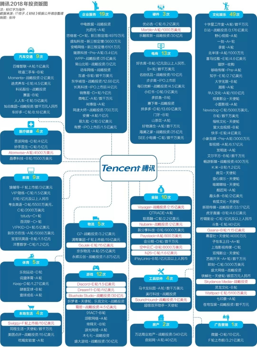 第一类通过投资或并购形成具有主控地位的平台型公司,比如腾讯音乐、阅文、微众银行;第二类,在核心垂直市场上可以和腾讯有很强联动,最典型的就是京东、新美大、滴滴、58同城、拼多多;第三类,能帮助腾讯在其主营业务垂直产业链中,获取更大的生态价值以及稳固护城河,比如游戏、内容。