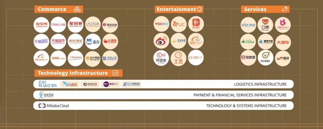 阿里生态经济体,注:黄色背景的圆圈为阿里收购或投资的业务。