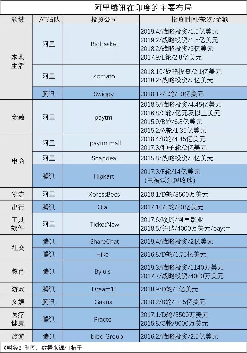 创新工场高级投资经理阮飞在《印度的机会在哪里》一文中这样总结阿里腾讯各自在印度的投资策略:“腾讯的策略是投头部标的,只要是市场中的龙头企业,不分领域,有机会都会参与;阿里还是在自己擅长的电商、支付、物流、外卖等领域下重注,并且依托于PayTM进行产业链布局,也通过PayTM的主体进行了一系列投资与并购。”