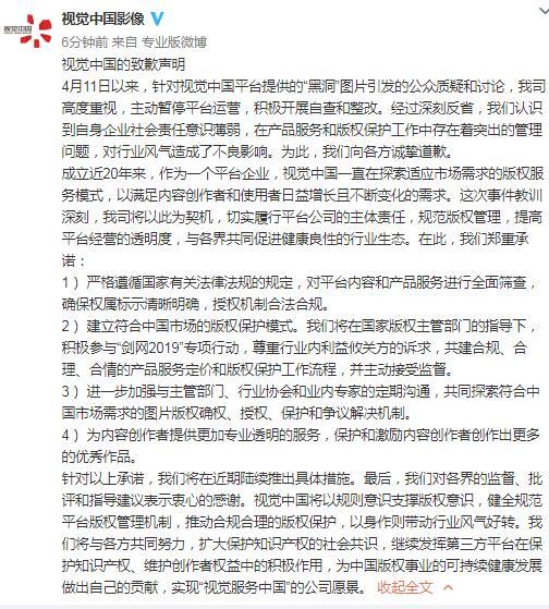 4月18日晚间22:20左右,视觉中国在官方微博发布《视觉中国关于接受天津网信办行政处罚的声明》以及《视觉中国的致歉声明》。视觉中国在致歉声明中表示,严格遵循国家有关法律法规的规定,对平台内容和产品服务进行全面筛查,确保权属标示清晰明确,授权机制合法合规。