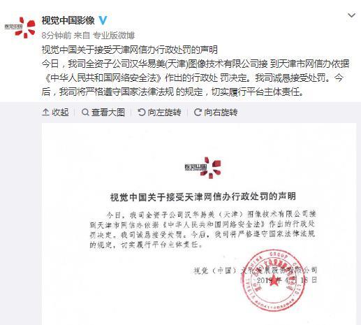 天津市网信办依法对视觉中国网站做出行政处罚
