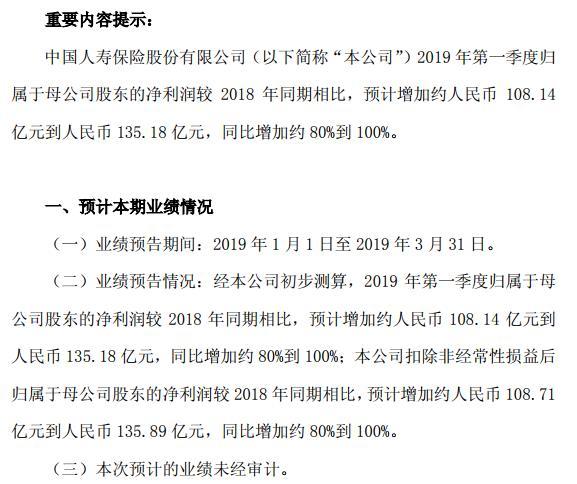 4月18日,中国人寿公告称,2019年第一季度归属于母公司股东的净利润较2018年同期相比,预计增加约108.14亿元到135.18 亿元,同比增加约80%到100%。