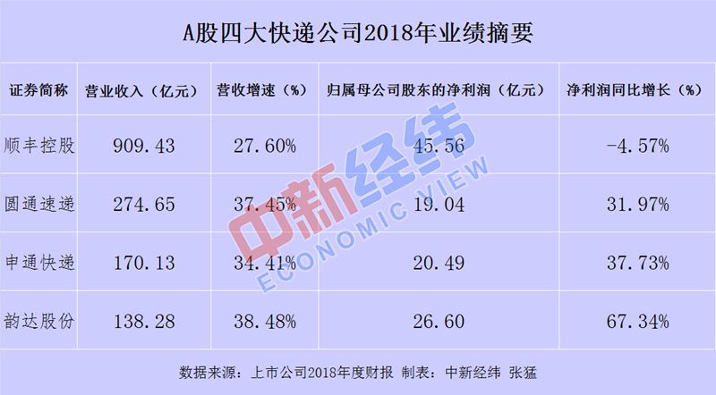 中新经纬客户端梳理发现,顺丰控股、圆通速递、申通快递和韵达股份四家公司,2018年分别实现净利润45.56亿、19.04亿、20.49亿、26.6亿,同比增长分别为-4.57%、31.97%、37.73%和67.34%,除顺丰净利润负增长外,其他三家快递公司均实现超过两位数的增长。值得注意的是,四家快递公司营收增速最低的也是顺丰控股。