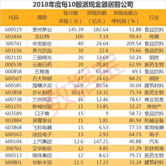 派现年年有,今年尤其高。统计显示,每10股派现金额在10元以上的有39家,每10股派现金额最高的是贵州茅台,3月29日公司年报中披露了年度分配方案,拟每10股派发现金红利145.39元(含税),合计派现金额182.64亿元,与公司2018年度实现352亿元的净利润相比,分红占净利润的比例高达50%以上;其次是吉比特,每10股派现金额为100元;华宝股份、养元饮品每10股派现金额分别为40元、30元;三钢闽光、云南白药,每10股均派现20元。