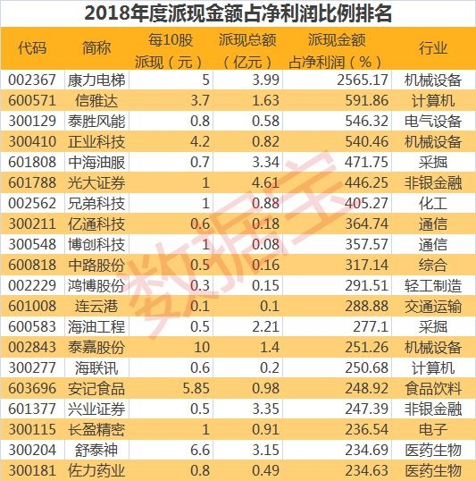 2018年度派现金额超净利润的有57家,分别是康力电梯、信雅达、泰胜风能等,派现率在50%以上的有285家,派现率在30%~50%的有580家。