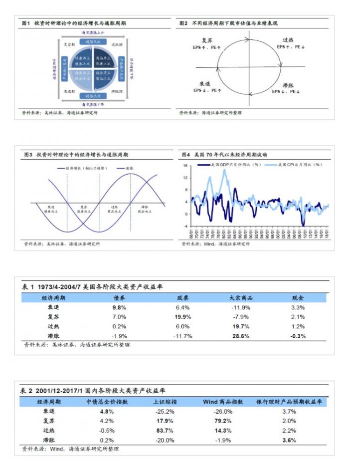 采用美国1973年4月-2004年7月样本数据作为研究对象,滞胀期(共86个月)资产配置顺序依次为现金(年均回报率-0.3%,下同)>商品(28.6%,70年代石油危机冲击掩盖了非石油类大宗价格下跌)>债券(-1.9%)>股票(-11.7%)。衰退期(共58个月)资产配置顺序依次为债券(9.8%)>股票(6.4%)>现金(3.3%)>商品(-11.9%)。复苏期(共131个月)资产配置顺序依次为股票(19.9%)>债券(7.0%)>商品(-7.9%,油价下跌拉低了大宗商品收益率)>现金(2.1%)。过热期(共100个月)资产配置顺序商品(19.7%)>股票(6.0%)>现金(1.2%)>债券(0.2%)。