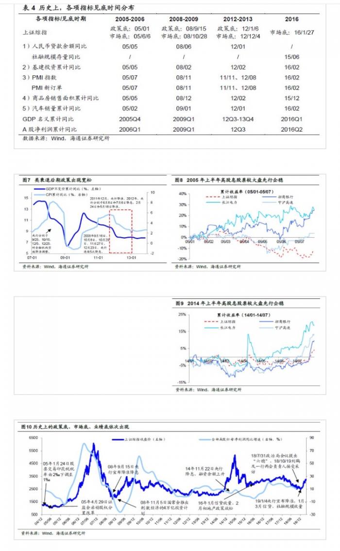 回顾历次市场底部时期的信号:第一次是05年1月降印花税上证综指1200点附近反弹,05年4月29日股权分置改革启动时也在1200点附近,这是个政策底位置,市场底出现在05年6月6日的998点,业绩底则在06Q1出现。第二次是08年9-10月降息降准等政策出台,上证综指在10月28日跌至1664点的市场底,业绩底则在09Q1出现。第三次是11年12月降准、12年1月地产结构性放松,12年1月6日上证综指2132点为政策底,之后反弹探底直到12年12月4日上证综指1949点为市场底,出现中级反弹,创业板指585点见底开启结构性牛市。2014年11月22日央行下调贷款基准利率后货币政策转向宽松,上证综指最高涨至15/6/15的5178点。第四次在2016-2017这轮市场反弹中,2016年1月前后宏观政策开始释放稳增长信号,2016年1月新增信贷达2.5万亿,随后市场底在16年1月27日上证综指2638点出现,16年2月2日央行出台政策降低买房首付比例,业绩底则在16Q2出现。