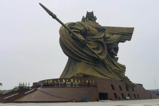 雕像总高58米,寓意关公一生度过了58个春秋,重1200余吨,内部采用钢构固定,外贴4000多片青铜片。关公圣像双目微醺,不怒而威,侧身迎风而立,右手拖一把70米长大刀,整个身躯如山峦般屹立。