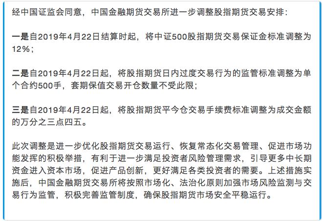 一是自2019年4月22日结算时起,将中证500股指期货交易保证金标准调整为12%;
