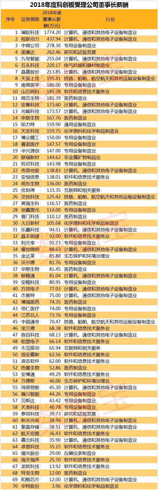 科创板董事长薪酬排行来了!这家公司极大方,董事长薪酬仅落后于2家A股公司,还有6家公司超200万