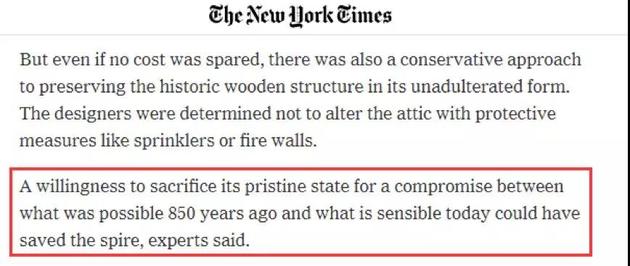 因此,《纽约时报》采访的一些专家认为,如果当时设计团队能够在维护850年的古建筑的原始风貌上做出一些牺牲,考虑当代敏感复杂的火灾情势后采取一个更折中的保护方案,如今这场大火中很多被严重损毁的地方,就可以避免或是更好止损了……