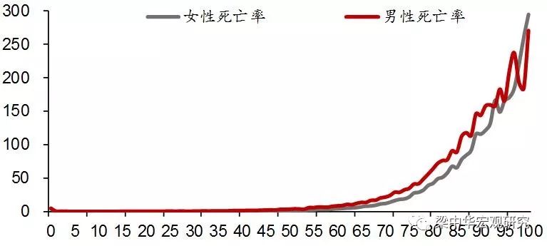 图表:2015年我国不同年龄阶段男女性的死亡率(‰)