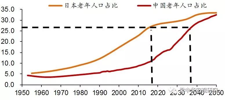从国际比较来看,最具代表的老龄化国家是日本,当前日本65岁以上老年人口占比为27%,属于超老龄化社会。按照我国当前的速度,我们或在2037年达到日本现在的水平,到2050年的时候,中国或将与日本当时的老龄化水平相接近。