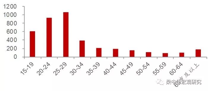图表:我国各年龄阶段“光棍儿”数量(万人)