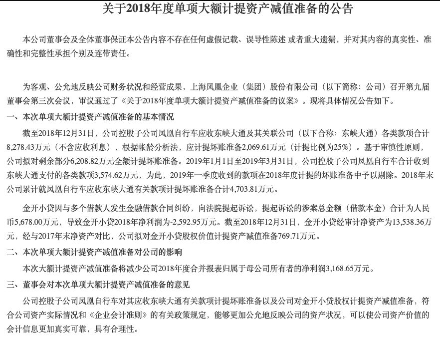 公告称,2018年末,上海凤凰累计就凤凰自行车应收东峡大通有关款项计提坏账准备合计4703.81万元;此外,上海凤凰还对旗下金开小贷股权价值计提资产减值准备769.71万元。