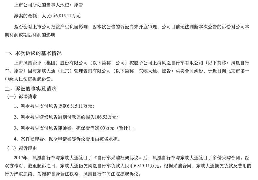 当时上海凤凰公告称,控股子公司凤凰自行车因与东峡大通买卖合同纠纷,向北京市第一中级人民法院提起诉讼。截至起诉之日,东峡大通拖欠货款6815.11万元,请求法院判令被告支付欠款并赔偿逾期付款违约损失186.52万元;以及支付原告律师费、担保费等20.00万元(暂计)、案件受理费、保全申请费等诉讼费用。