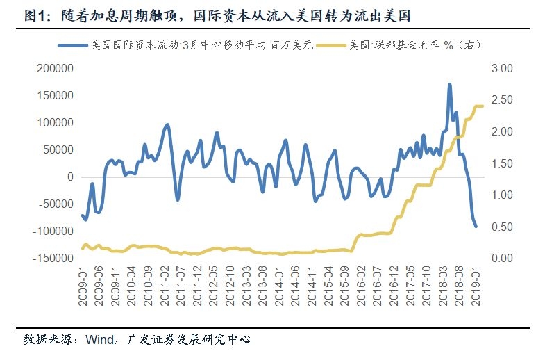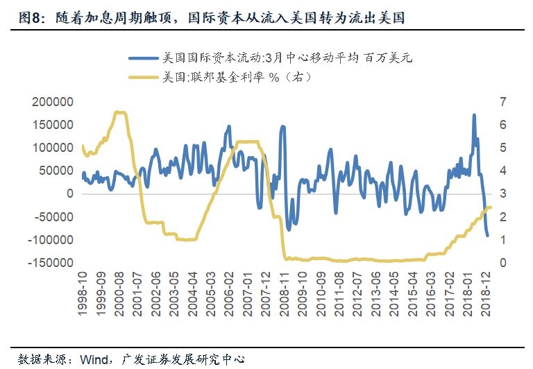 美国国际资本流动数据是一个很好的标尺(图),我们可以看到,在加息周期临近触顶的时候,国际资本净流入美国的速度快速下降;至2018年底变为净流出。
