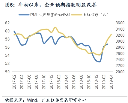 3)稳增长和减税降费导致企业预期好转。政治局会议指出一季度“市场信心明显提升”。我们从PMI生产经营活动预期、BCI企业销售前瞻指数等预期指标的变化中可以看到这一过程。