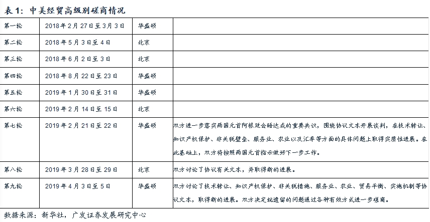 从2018年2月起,中美之间进行了9轮经贸磋商。其中前四轮是在2018年2月至8月、后五轮是2019年1月至4月陆续开展。2019年2月的第六轮经贸磋商中,中美“在技术转让、知识产权保护、非关税壁垒、服务业、农业以及汇率等方面的具体问题上取得实质性进展”。2019年4月的第九轮经贸磋商中,“双方讨论了技术转让、知识产权保护、非关税措施、服务业、农业、贸易平衡、实施机制等协议文本,取得新的进展。双方决定就遗留的问题通过各种有效方式进一步磋商”。