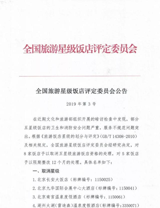 据了解,文化和旅游部近期组织开展了第二轮暗访检查,以上处理决定即根据暗访检查的结果、严格依据《旅游饭店星级的划分与评定》(GB/T14308-2010)及相关规定而作出。