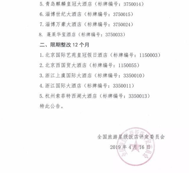 被取消五星级旅游饭店资格的8家饭店分别为北京长安大饭店、北京九华国际会展中心大酒店、北京南宫温泉度假酒店、湖州太湖(雷迪森)温泉度假酒店、青岛麒麟皇冠大酒店、淄博世纪大酒店、淄博万豪大酒店、蓬莱华玺酒店。被要求限期整改12个月的5家饭店分别为北京国际艺苑皇冠假日酒店、北京西国贸大酒店、浙江上虞国际大酒店、浙江国际大酒店、杭州索菲特西湖大酒店。