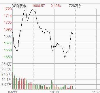 4月23日盘中,猪肉概念板块回升,多股翻红,正虹科技涨停,天康生物、广弘控股等涨逾3%。